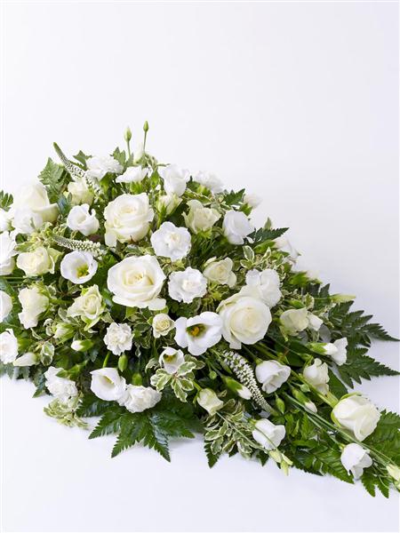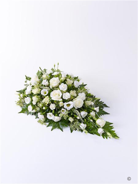 White large-headed roses, lisianthus, spray carnations, spray roses and Veronica are carefully arranged with leather leaf and pittosporum to create this delicate spray.