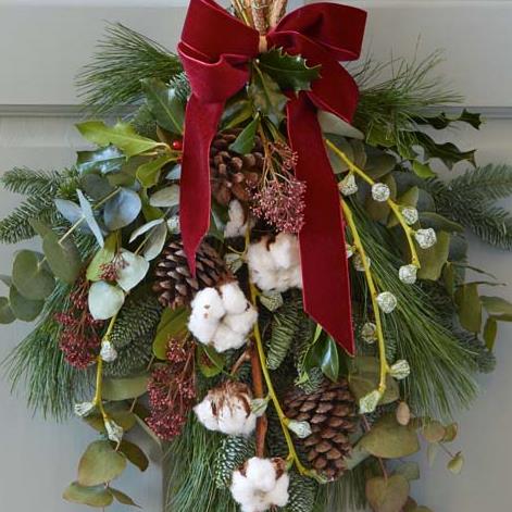Known as a 'swag' (sort of like a flat bouquet meant for hanging on a door) this beautiful decoration will make the whole street merry. It'll feature fresh blooms and foliage. Expect shades of red and green, with peach and cream highlights and pops of burgundy and cerise.