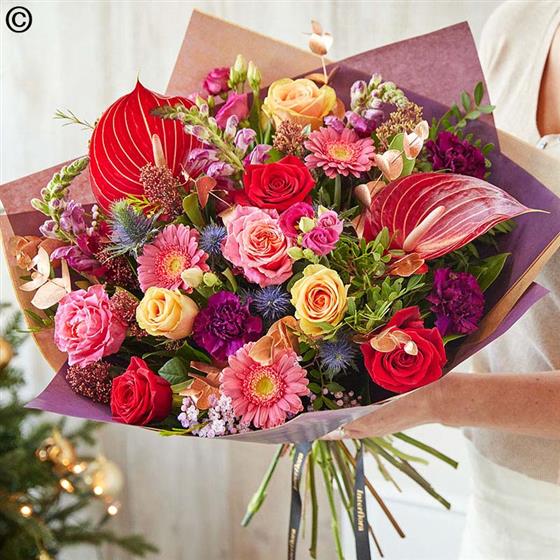 A luxurious bouquet expertly handcrafted and delivered perfectly pre-arranged. Jolly festive tones for a truly Christmassy feel.