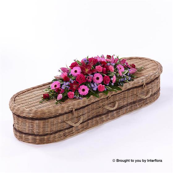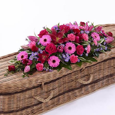 This bright casket spray feautring a classic selection of flowers in pink, red and lilac includes large-headed Rose, carnations, Gerbera and Oriental Lily complemented by luxurious foliages. Approximate height 92cm (3ft).
