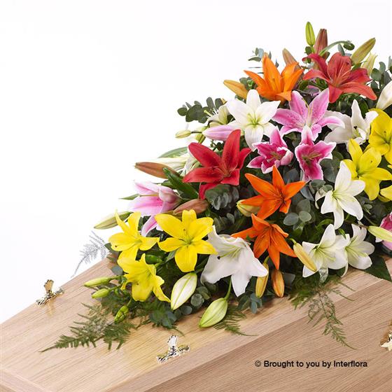 A blanket of Oriental Lily in mixed colours is beautifully complemented by an array of luxurious deep green leaves to create this simple but striking casket spray. Approximate height 122cm (4ft).