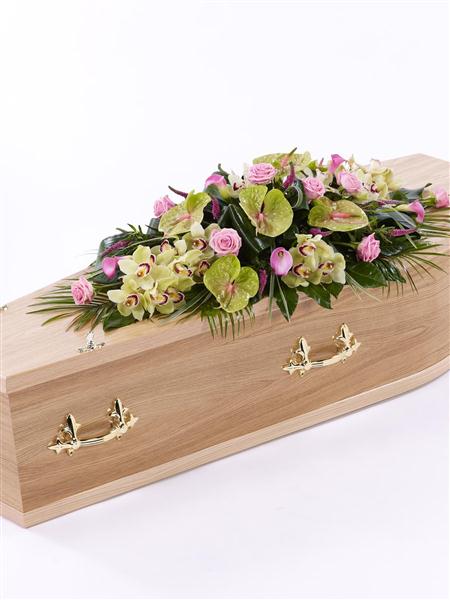 This distinctive casket spray brings together the soft green shades of cymbidium orchids and green anthurium, with delicate pink calla Lily, veronica and large-headed Rose. The spray is finished with aspidistra, aralia leaves, palm leaves and China grass. Approximate height 92cm (3ft).