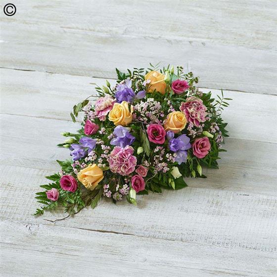 A profusion of fragrant pastel blooms arranged in a teardrop shape. Features scented freesia, peach roses, and natural willow and grass.