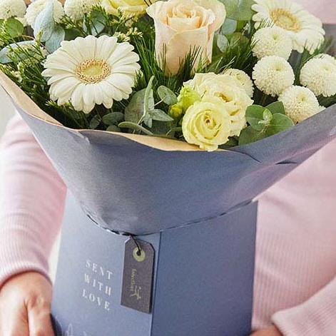 Hand-tied flowers expertly arranged and perfectly presented in a lovely gift box. Frosty tones reminiscent of a winter wonderland