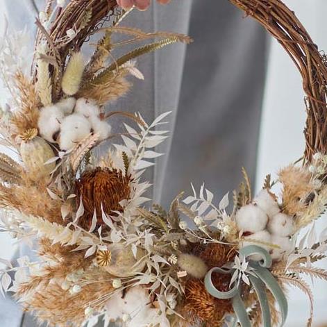 A handcrafted wreath of dried winter-inspired flowers, expertly arranged by a local florist and made to last.